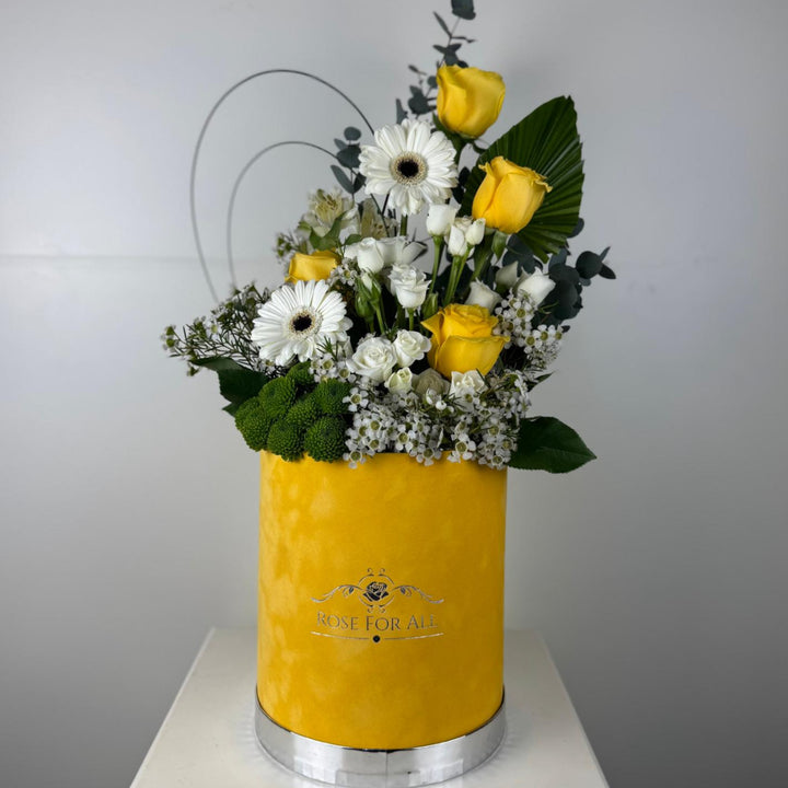 تنسيق مبهج من الزهور البيضاء و الصفراء داخل بوكس أصفر أنيق من المخمل يضيف لمسة من الدفء والبهجة إلى أي مكان. الإرتفاع بحدود 57 سم و العرض 20 سم.